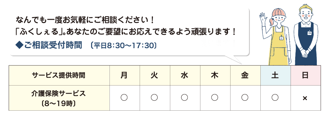 介護保険外サービスを提供している「ふくしぇる」は、ご利用者様の「あったらいいな!」のサービスをご提供いたします!