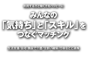 サービスを必要としている人とそれを提供できる人を繋げる、マッチングを行うことで、互いの「生きがい」や「やりがい」につながり、【年を重ねてもイキイキと元気に過ごすことができる】それが、私たちの願いです。
